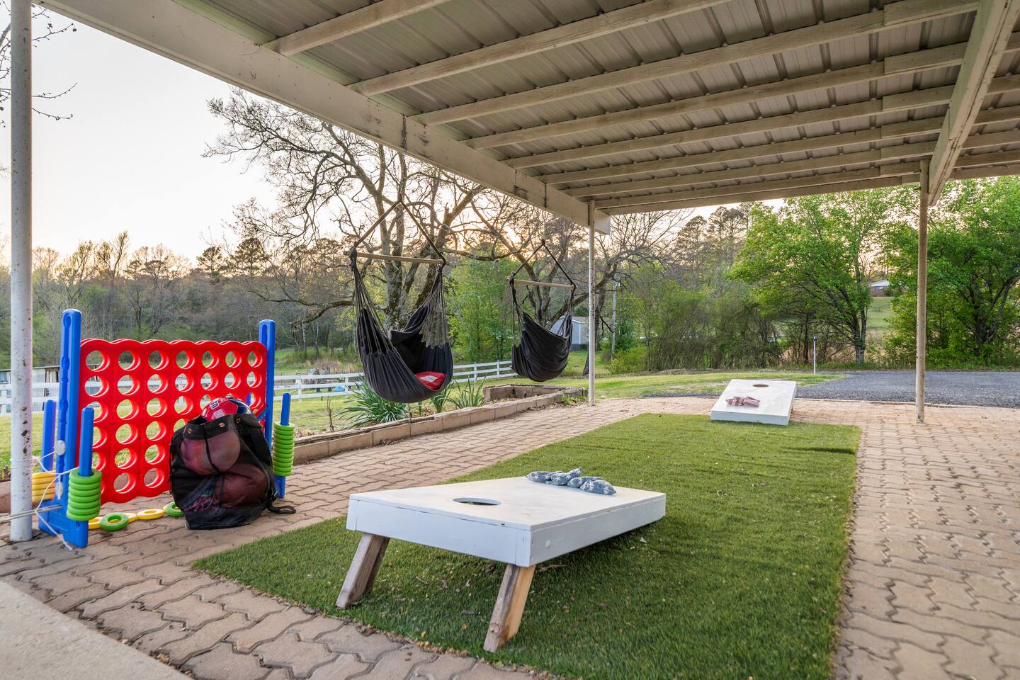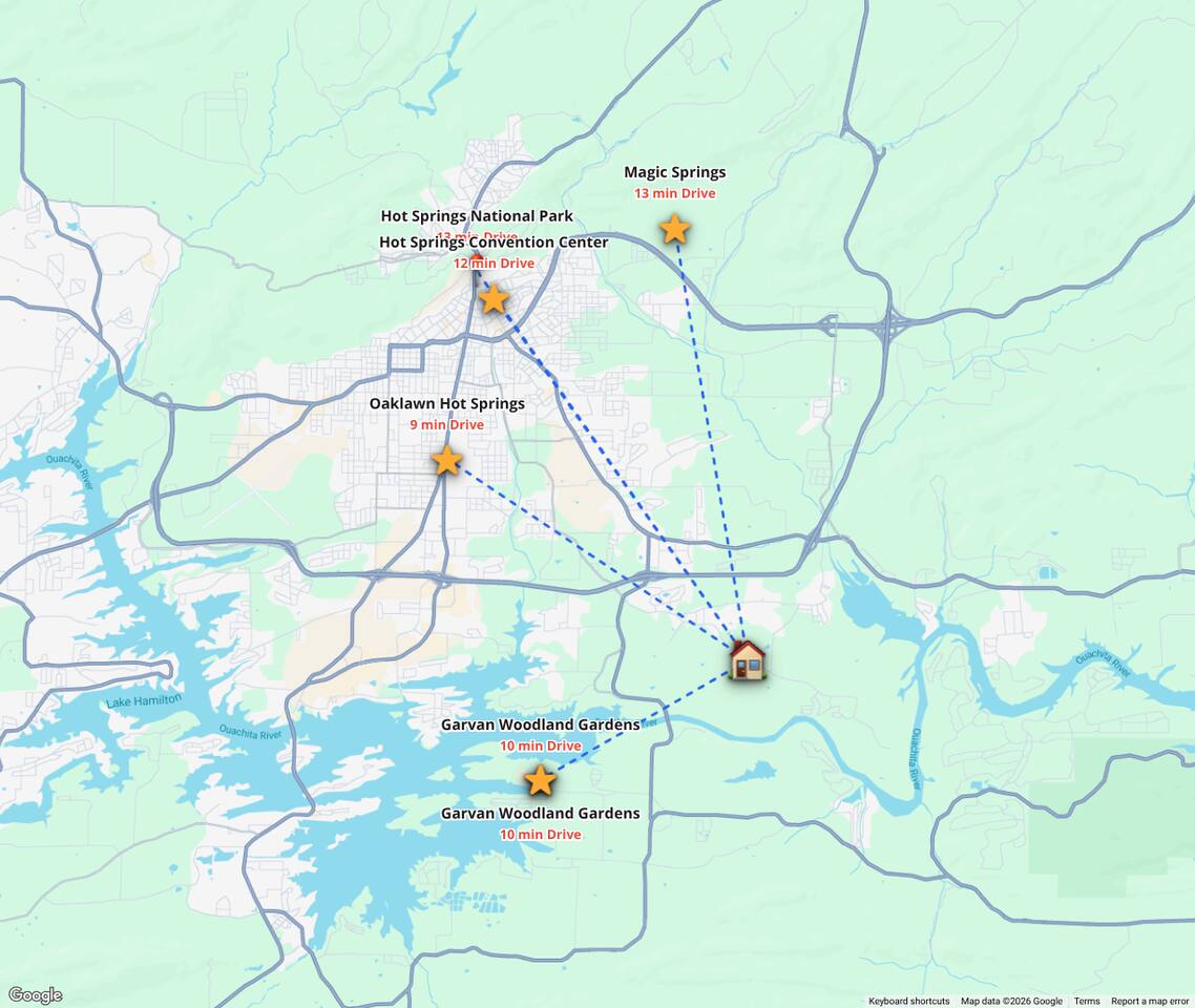 Hands-on farm animal experiences, a nostalgic Retroverse Museum, cozy fire pit, indoor and outdoor games, and an exceptionally well-stocked kitchen designed for memorable family stays. Kitchen & Dining Room ∙ FULLY stocked kitchen w/plenty of counterspace for at-home baking and cooking ∙ Elegant KEURIG, coffee maker, tea kettle, and toaster ∙ Cooking oils and seasoning essentials ∙ Abundance of dishware, glassware and silverware, including children’s ∙ Full-sized fridge and freezer ∙ Glass cooktop and oven ∙ Microwave ∙ Airfryer ∙ Crockpot ∙ Dishwasher ∙ Blender ∙ Dining room table, seating for 2 plus 2 extra chairs ∙ Large countertop space for food preparation ∙ (2) Breakfast counters with 4 high-top chairs Living Room #1 ∙ Electric fireplace ∙ Ceiling fan ∙ Sofa bed (sleeps 2) ∙ Room-darkening shades ∙ Books ∙ Board games Living Room #2 ∙ Smart TV ∙ Netflix, Prime Video, Disney Plus, Hulu, HBO and more ∙ Electric fireplace ∙ Ceiling fan ∙ Futon bed Bedroom #1 (Primary Bedroom) ∙ King size bed ∙ Premium mattress and comforter ∙ Smart TV ∙ Dresser ∙ Room darkening shades ∙ Bedside table and lamp ∙ Large closet w/ hangers ∙ Ceiling fan ∙ Bedroom bench ∙ Rocking chair Bathroom #1 (Ensuite) ∙ Large walk-in Shower ∙ Double vanity with mirror ∙ Shampoo, conditioner and body soap ∙ Hair Dryer ∙Makeup washcloth Bedroom #2 ∙ Queen size bed ∙ Smart TV ∙ Room darkening shades ∙ Bedside table and lamp ∙ Large closet w/ hangers ∙ Ceiling fan ∙ Bedroom bench Bedroom #3 ∙ Double bed ∙ Smart TV ∙ Dresser ∙ Room darkening shades ∙ Bedside table and lamp ∙ Closet w/ hangers ∙ Ceiling fan ∙ Rocking chair Bedroom #4 ∙ Queen size bed ∙ Room darkening shades ∙ Bedside table and lamp ∙ Ceiling fan ∙ Workstation ∙ Large capacity washer/dryer Bathroom #2 ∙ Shower/ Bathrub ∙ Shampoo, conditioner and body soap ∙ Hair Dryer ∙ Makeup washcloth 🏷 Outdoor Space(s) Patio/Porch ∙ Rocking chairs ∙ Outdoor seating and coffee table Back Patio ∙ Grassy Play area ∙ BBQ grill ∙ Large outdoor Connect Four game ∙ Cornhole ∙ Firepit ∙ Outdoor dining table 🏷 Parking Free parking on premises for more than enough vehicles! 🚘 Nearby ∙Retroverse Museum (on property): multi-generation attraction stepping into pop culture past (toys, props, statues, cars & more). ∙Arkansas Alligator Farm & Petting Zoo (10 min driving): Family-favorite with interactive animals and kid-friendly fun. ∙ Hot Springs National Park Grand Promenade (10 min driving): Scenic walking path, overlooks, and classic park experience. ∙ Fordyce Bathhouse Museum (10 min driving): Iconic bathhouse showcasing Hot Springs history and architecture. ∙ Bathhouse Row (10 min driving): Famous historic row of bathhouses and sightseeing core. ∙ Hot Springs Mountain Tower (12 min driving): Panoramic views of the Ouachita Mountains and city. ∙ Mid-America Science Museum (15 min driving): Hands-on exhibits perfect for kids and multi-generational groups. ∙ Downtown Hot Springs Shops & Galleries (15 min driving): Local boutiques, art, souvenirs, and strolling. ∙ Superior Bathhouse Brewery (15 min driving): Craft brewery inside a historic bathhouse using spring water. ∙ Kollective Coffee & Tea (15 min driving): Popular local coffee stop for relaxed mornings. ∙ The Pancake Shop (15 min driving): Well-known breakfast spot loved by visitors and locals. ∙ Mountain Valley Spring Water Visitor Center (15 min driving): Unique museum experience tied to local springs. ∙ Garvan Woodland Gardens (18 min driving): Botanical gardens with walking trails and seasonal displays. ∙ Lake Hamilton (18 min driving): Boating, fishing, lakeside dining, and scenic views. ∙ Oaklawn Racing Casino Resort (20 min driving): Horse racing, casino gaming, dining, and entertainment. ∙ Lake Catherine State Park (25 min driving): Waterfalls, hiking trails, swimming, and picnic areas. ∙ Magic Springs Theme & Water Park (25 min driving): Seasonal amusement and water park for families. ∙ Off Road Vehicle Park Hot Springs (25 min driving): Popular off-road trails for adventure seekers. ∙ Lake Ouachita State Park (30 min driving): Crystal-clear water, beaches, boating, and hiking. ∙ Ouachita National Forest Scenic Drives (35 min driving): Forest views, trail access, and peaceful nature escapes.